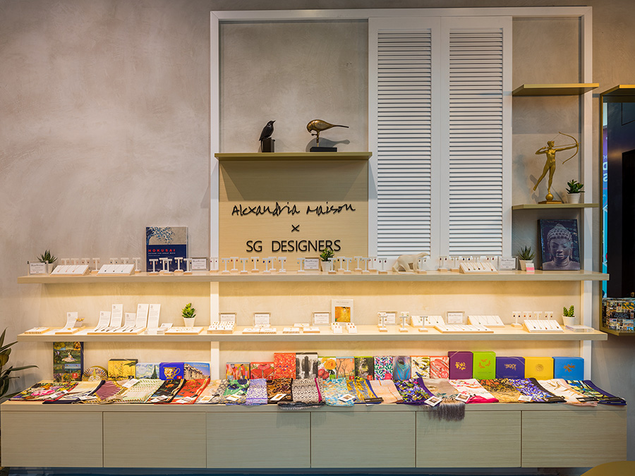 Moving along the concrete rendered wall, a series of wall display shelves houses the Singapore Designers’ and Museum collection of jewellery and accessories. The display shelves, in light wood and white colour, creates a simple backdrop to allow the products to be showcase in their best form. A series of rectangular frames and venetian windows reinforced the sense of homeliness.