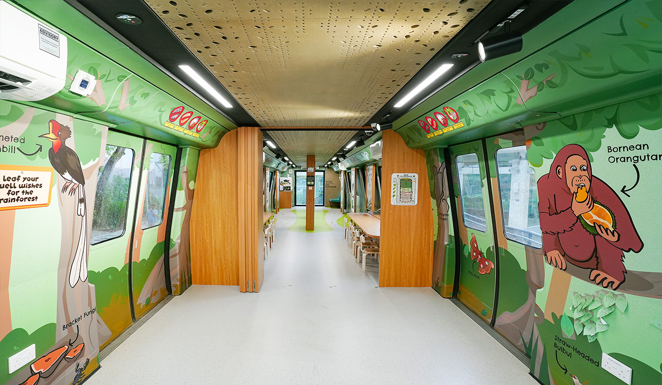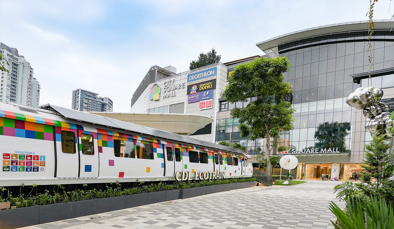 A decommissioned train cabin converted into a learning gallery, the CDL Eco-train is a first of its kind initiative in Singapore. Even though it has reached the end of its lifecycle as a train cabin, we hope to breathe new life into it by converting it into a learning gallery. This way, no additional building structures are required, reducing material usage and carbon emissions. The train is sited within the garden space of City Square Mall to encapsulate upon the entry promenade. With its striking exterior, we envisaged the train as a colourful educational board to showcase the Sustainable Development Goals (SDG) values and attract public attention.
