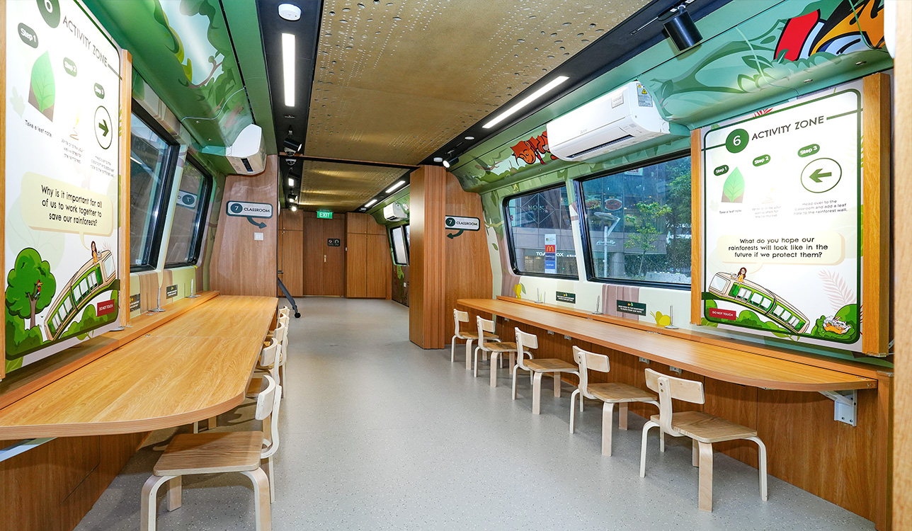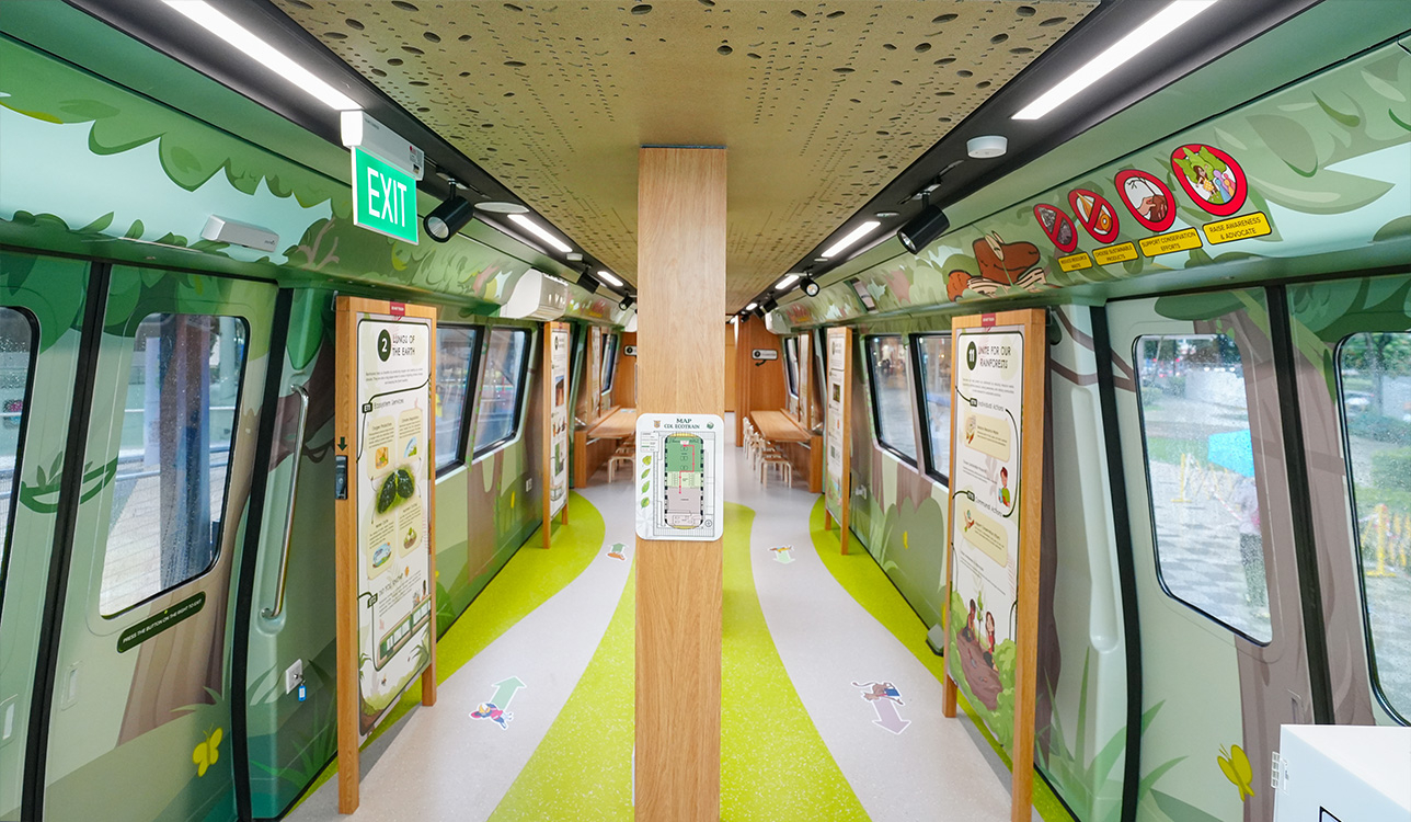 Operationally, the CDL EcoTrain is designed to achieve nett zero energy usage. To track energy from its rooftop solar panels in real time, it has an Energy Monitoring System that is driven by EcoStruxure and supplied by Schneider Electric. On the exterior, the train uses GUSH HydroPro Solar Enamel Paint, an eco-friendly water-based coating that is formaldehyde-free, ultra-low odor and extremely low VOC (volatile organic compounds) that minimizes damage to the environment. The solar reflective properties of the paint utilizes hollow glass beads to prevent excessive heat gain on the cabin interiors, reducing energy consumption for air-conditioning. The rubber flooring on the ramp and exterior flooring by BTSports is made from recycled tennis shoes(black) and tennis balls(green).