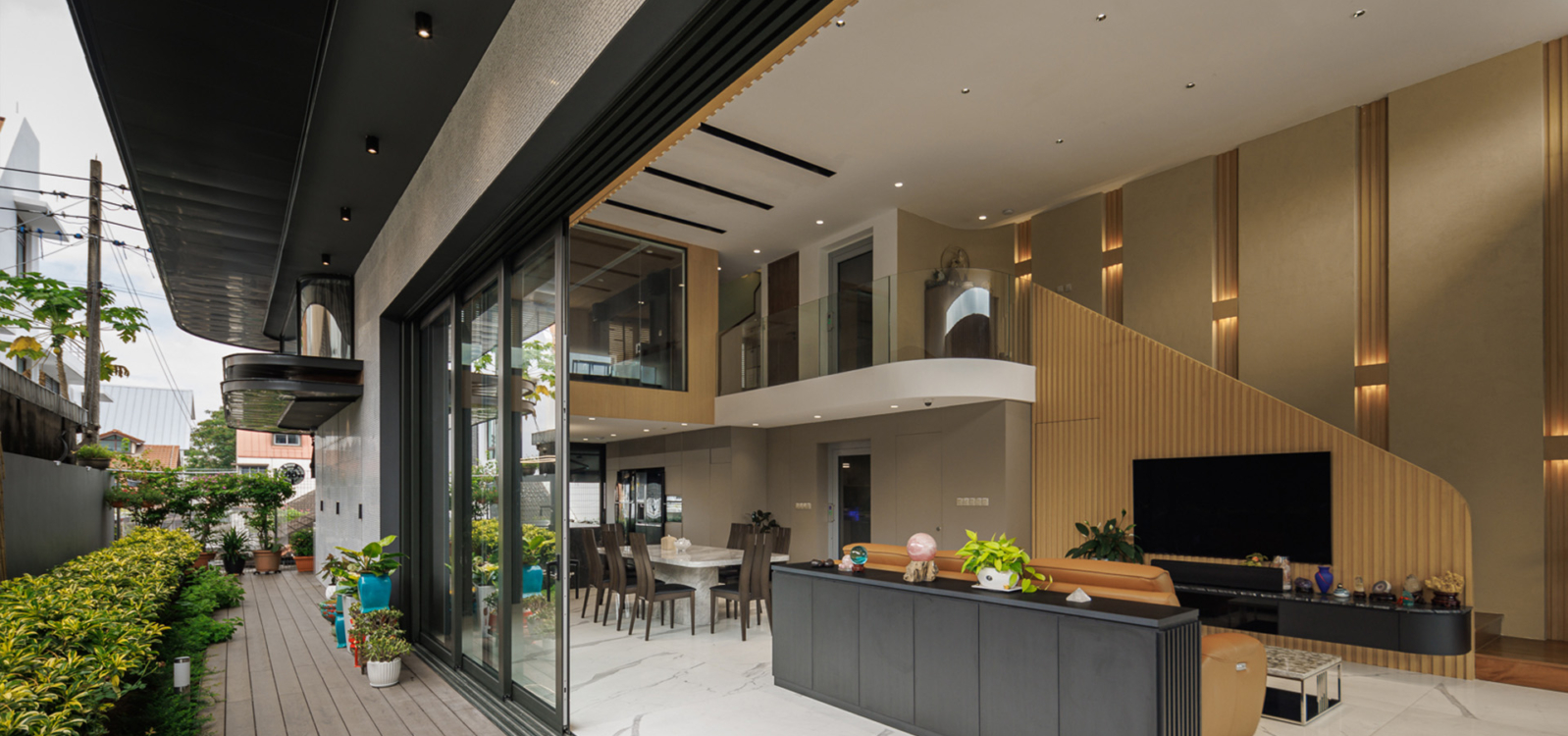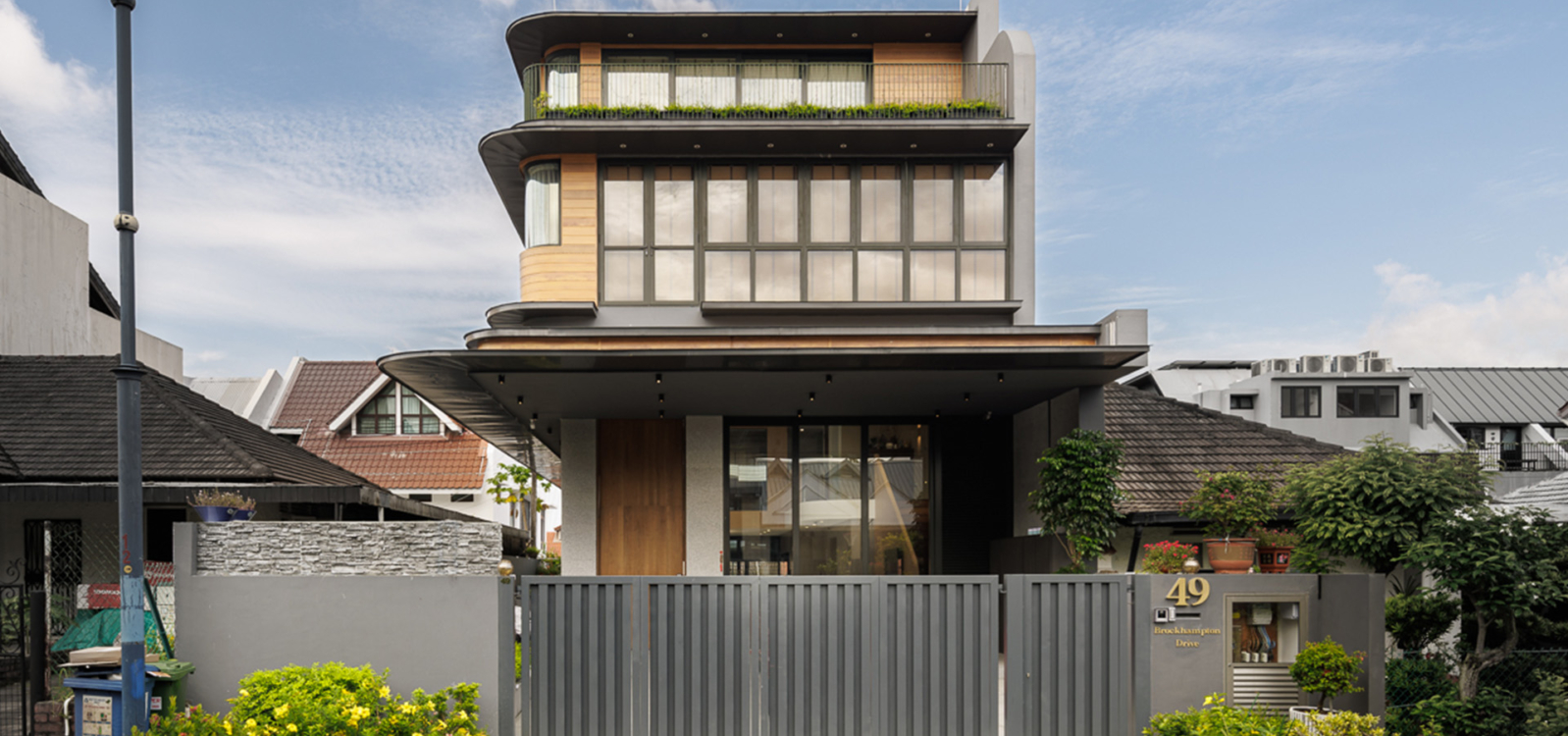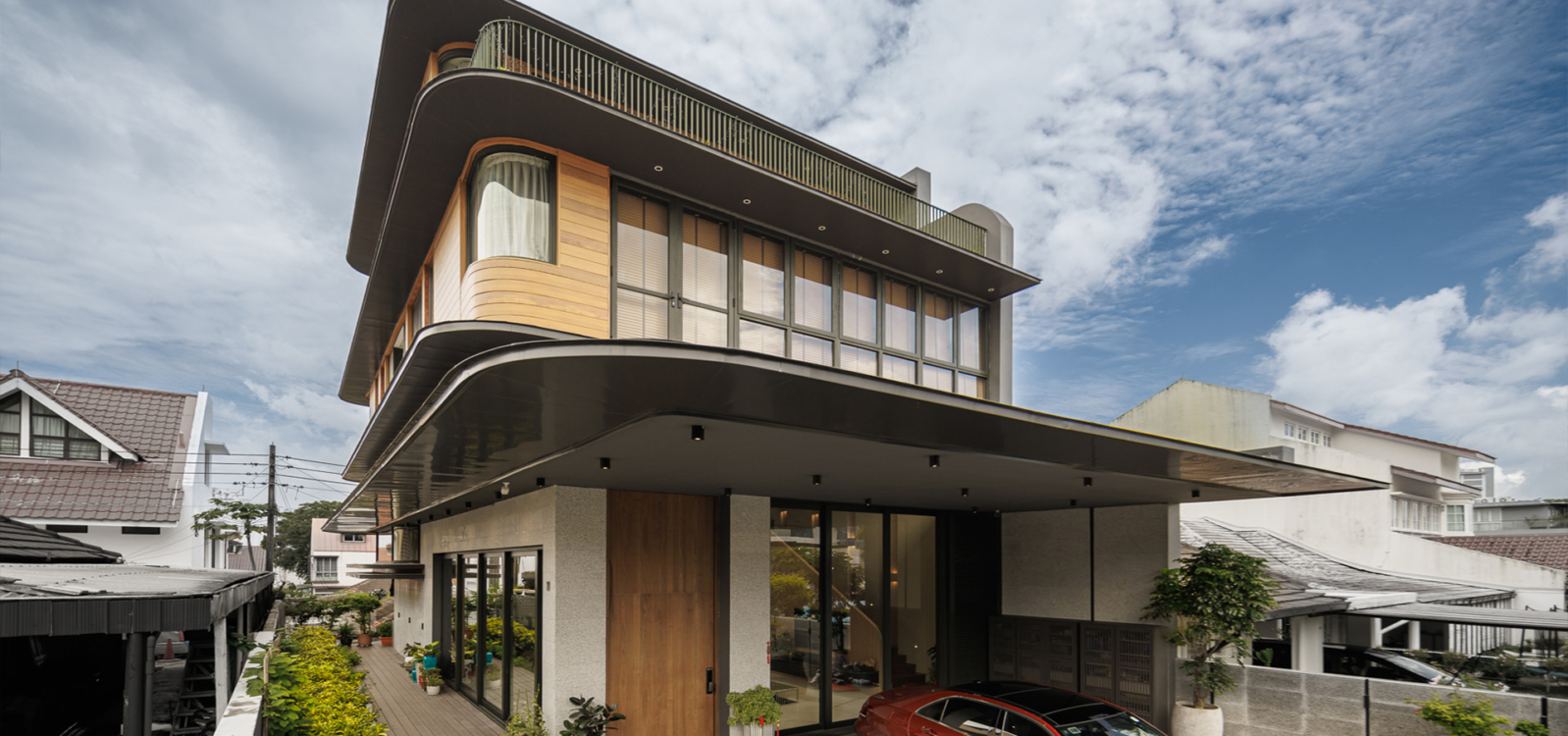 S House @ Brockhampton is a 2 storey semi-detached house with a mezzanine and an attic for a single family. The exterior house design is characterized with stepped terrace balcony and deep overhang that reflects the climatic response to the tropics. The interior design makes use of a high volume living/dining space to create a loft concept with a mezzanine floor as the entertainment room overlooking the high volume space. .