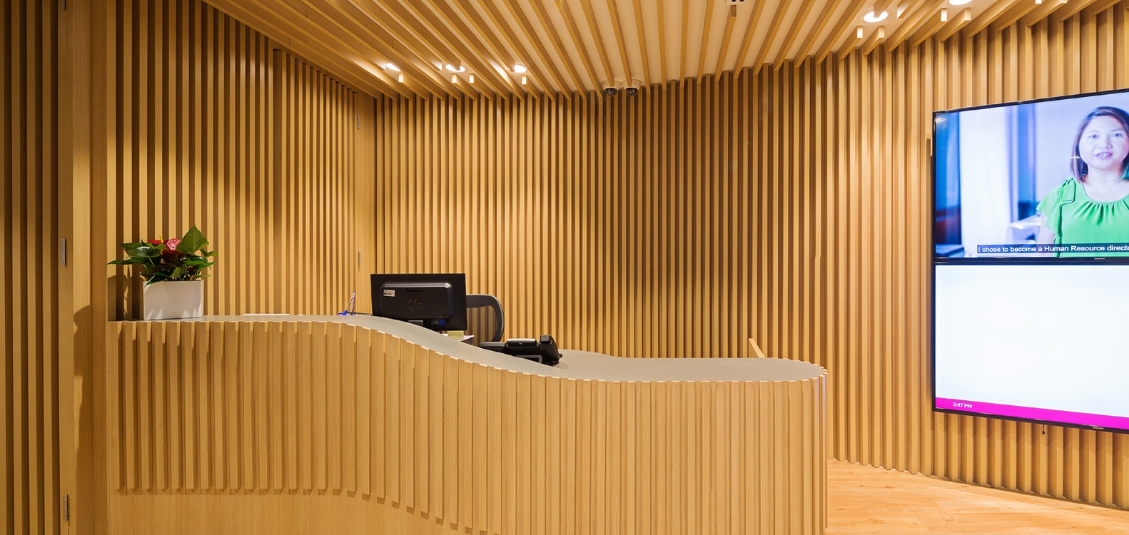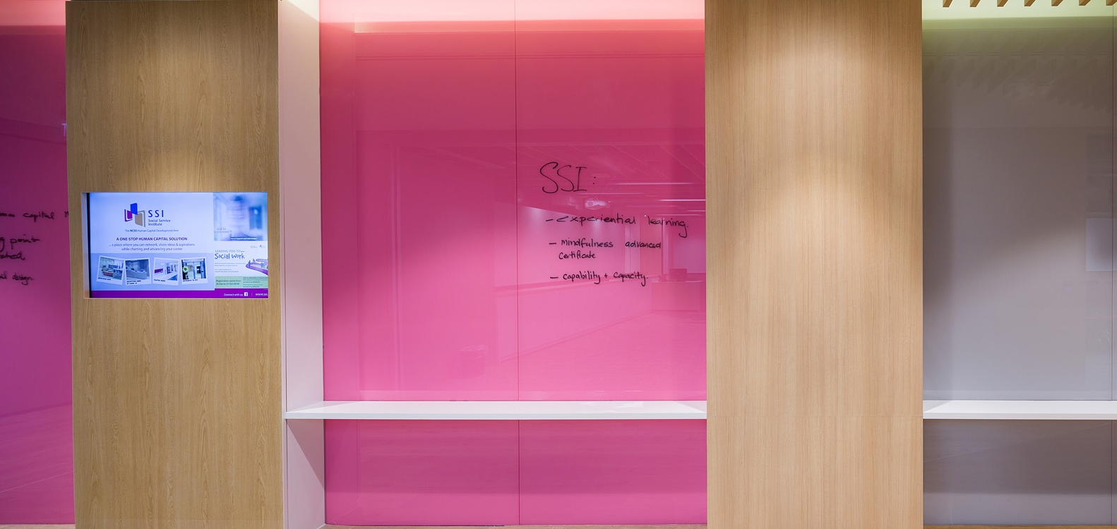 As SSI is frequent by the public, Universal Design is adopted to create an environment that will address the needs of all age group and people with different needs. At the entrance recception, the desk is designed with a sloping profile to allow the receptionist to engage with a person on wheelchair at the lower counter area, and to engage a standing adult at the higher counter area. This inclusive design is extended to the entire SSI spaces so as to encourage a fair environment where people of all walks of lives have a right to the space without compromise.