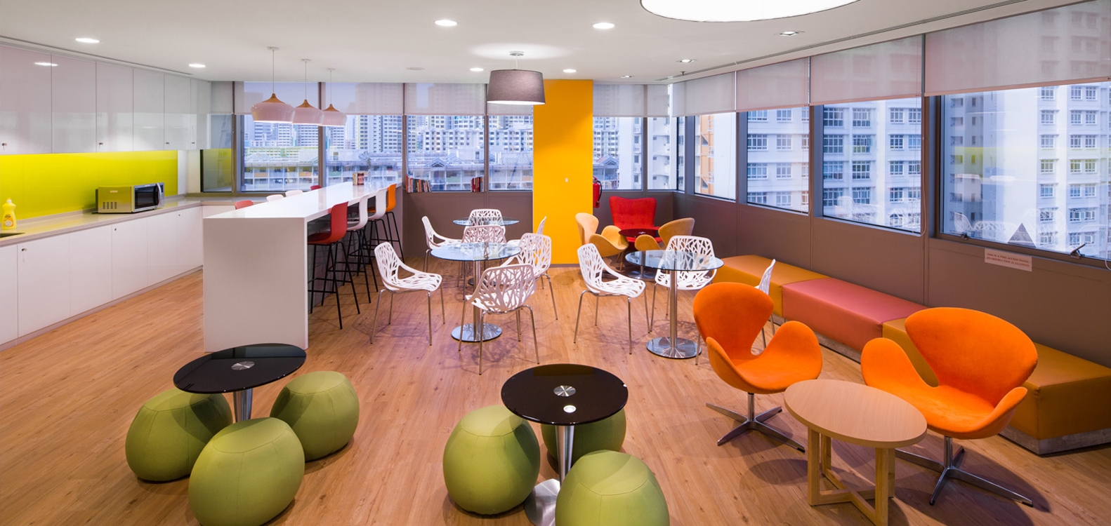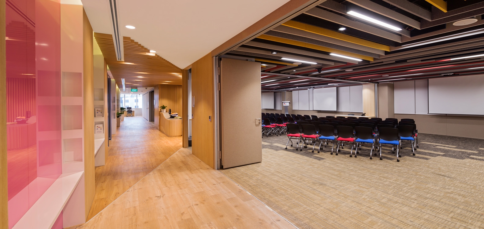 Instead of adopting a strict segregation of training facilities and staff office by floors, we allocated half the area (public) of each floor to students and the other half (private) to staff. We introduced informal collaboration spaces when public meet private. These informal collaboration spaces are pantries, library and corridor with writing surfaces nicely wrap by back painted glass around the entire core at every floor. Continuity is felt when user travels from one floor to another for training and meetings; continuity is felt when users interact at these informal collaboration spaces. The design encourages spontaneous interactions among staff, trainers and students.