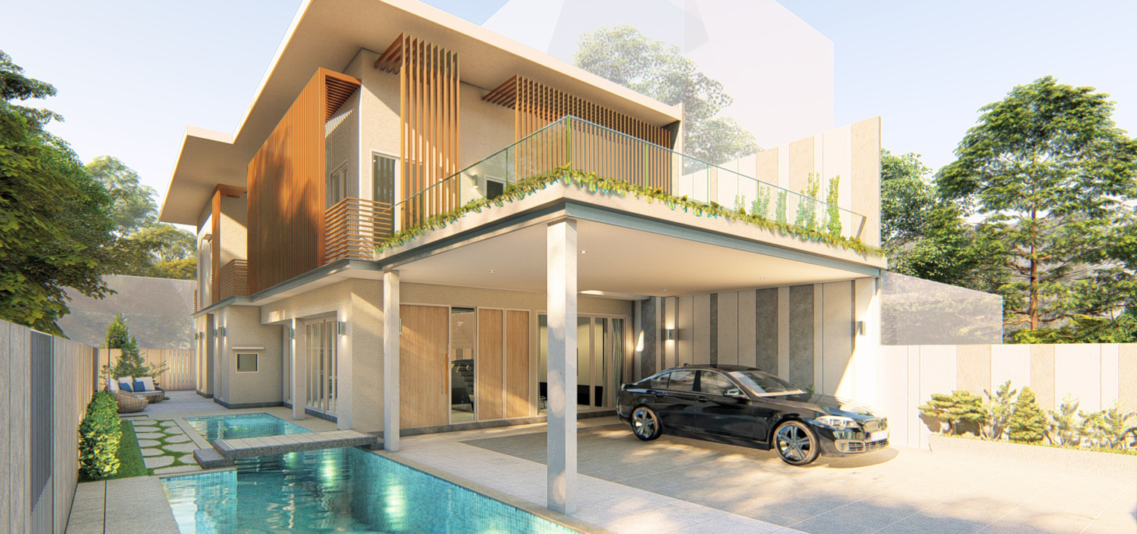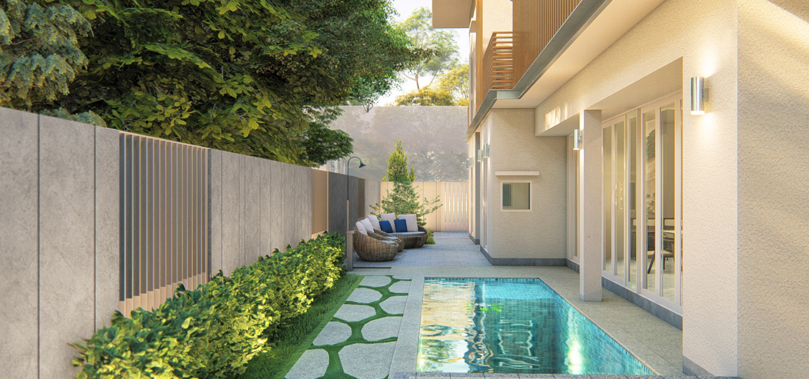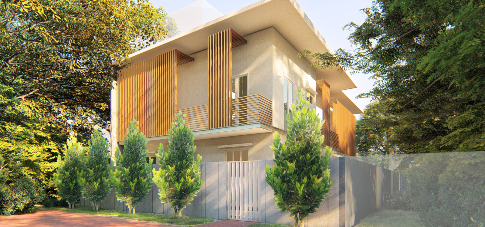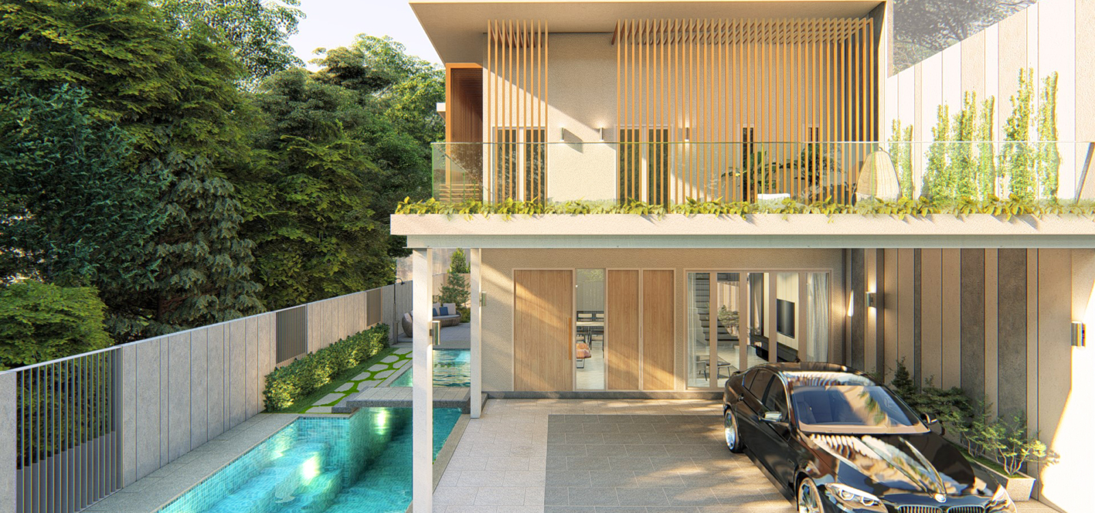 Y House @ Kesoma is a 2 storey semi-detached house for a couple. The design of the exterior is a modern interpretation of Mediterranean house – a dream and love of the couple – set within a tropical context. Vertical screens on the exterior creates a second layer of façade which provides sun shading and privacy for the owners.
