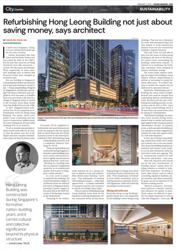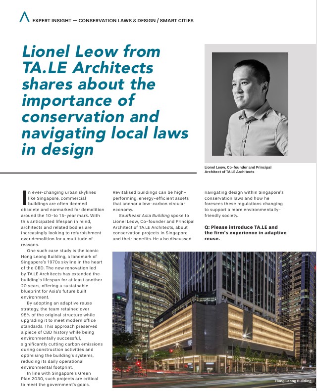 Hong Leong Building was constructed during Singapore’s formative nation-building years, and it carries cultural and collective significance beyond its physical structure – TA.LE co-founder and principal Architect Lionel Leow tells City & Country that the project was one of the largest and most complex refurbishment works the firm has done to date.